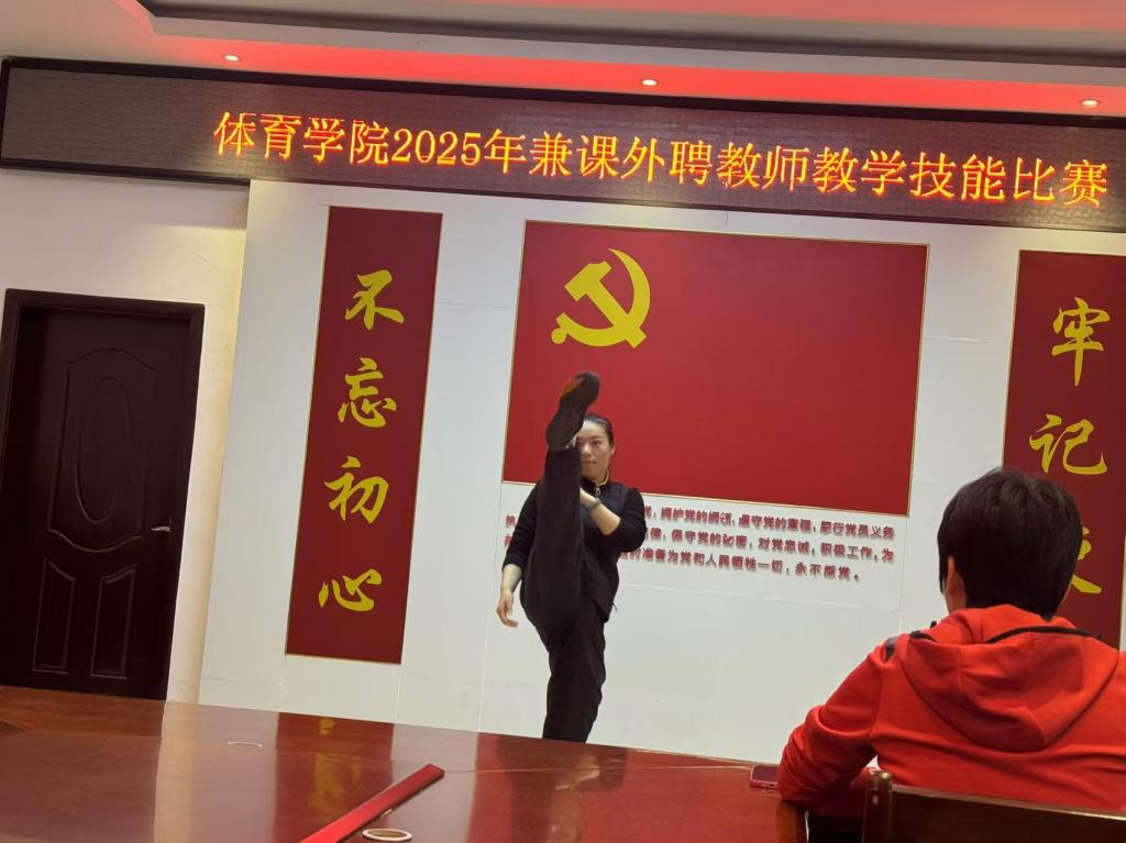 比赛现场气氛热烈、秩序井然。来自各专业方向的兼课外聘教师依次登台,按照“15分钟微课教学+5分钟技能展示”的流程展开角逐。微课教学中,教师们围绕篮球、乒乓球、羽毛球、网球等课程内容,精心设计教学环节,通过生动讲解、规范示范和趣味互动,将专业知识与实践操作有机融合,展现出扎实的教学功底与良好的课堂掌控力。